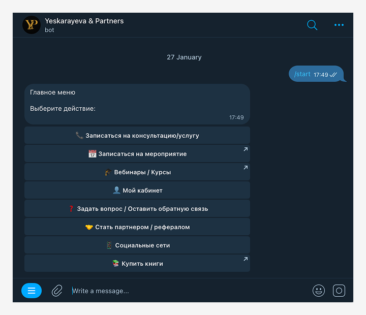 Разработать Telegram-бот для юридической компании Yeskarayeva & Partners с встроенным ИИ-агентом: онлайн-запись на консультацию, обработка вопросов, поддержка мультиязычности и интеграция с CRM.
